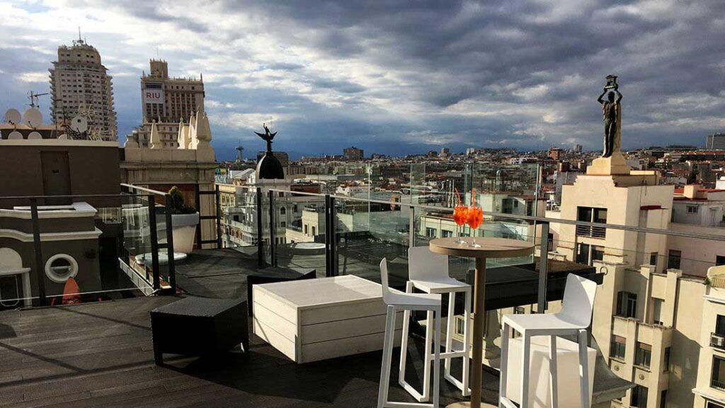 Terraza contemporánea con vistas hacia Plaza de España, formato moderno, zona lounge/restaurante/cocteles. Ideal para: Un plan de tarde-noche más “chill & moderno”, después del trabajo, con buena vista pero ambiente menos clásico.